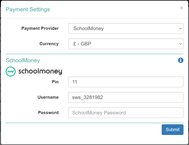 3) Back in SchoolWorkSpace in the SchoolMoney popup enter the new username and password along with your schools access pincode.